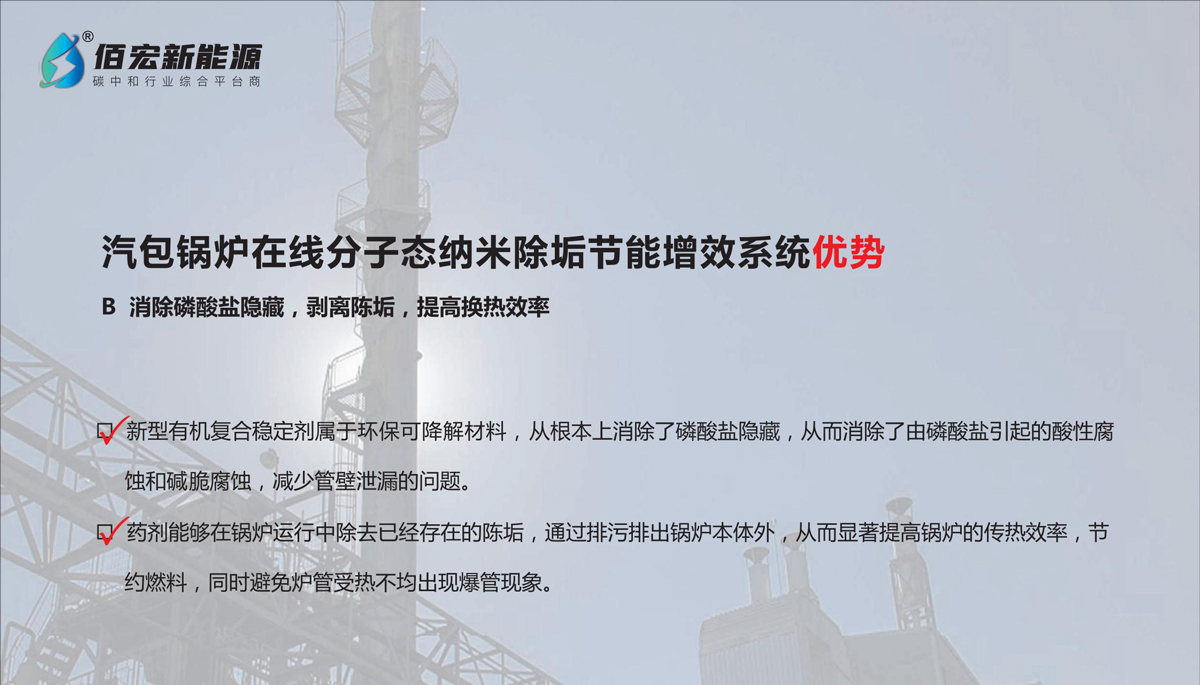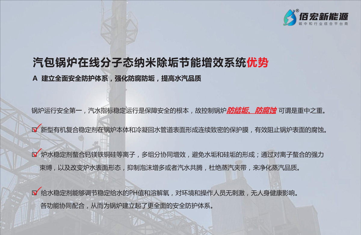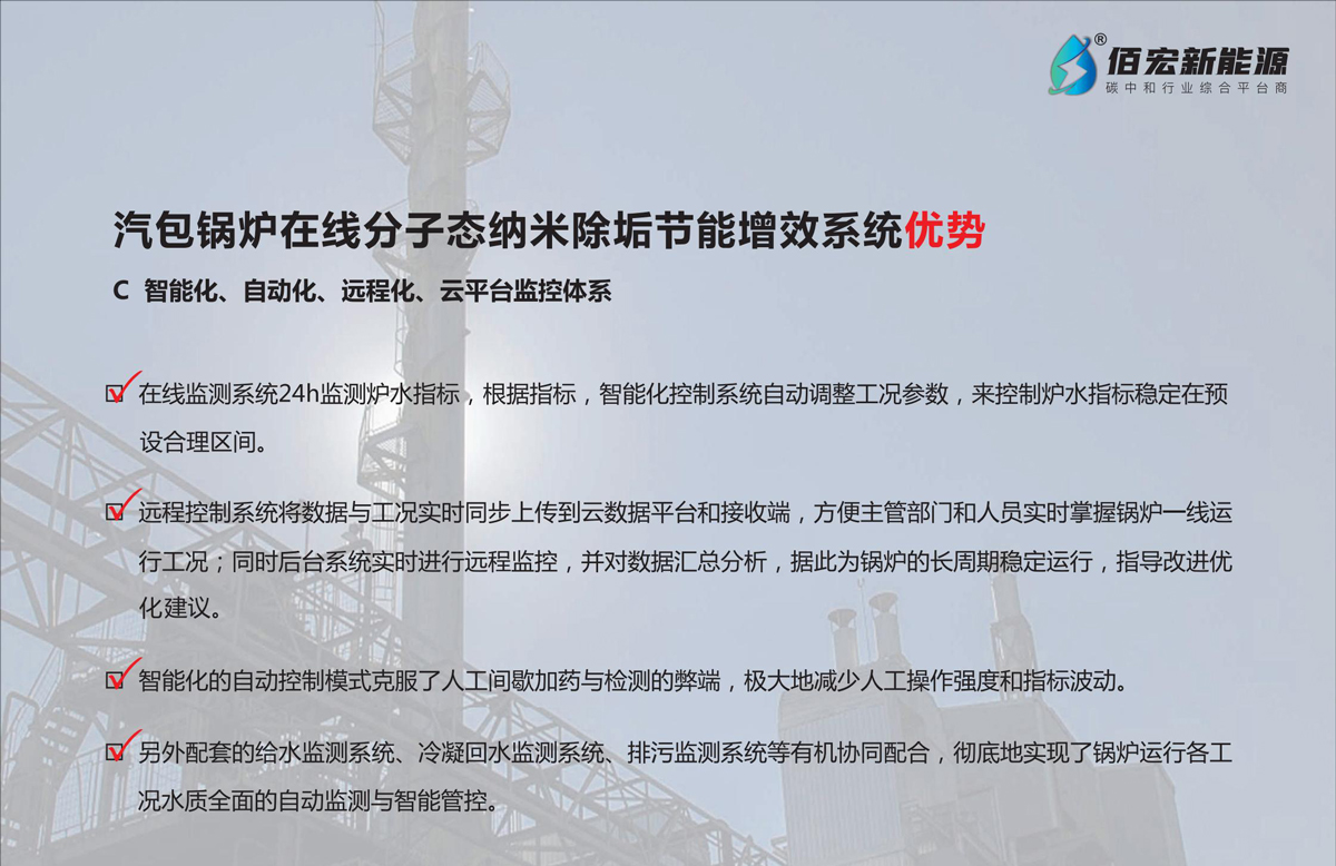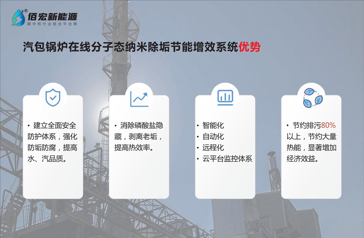 佰盛宏圖?除垢靈(BH-1000G)技術(shù)優(yōu)勢(shì):1.建立安全防護(hù)體系,強(qiáng)化防垢防腐,提高水、汽品質(zhì),確保鍋爐安全生產(chǎn)。2.消除磷酸鹽隱藏,剝離老垢,提高熱效率。3.建立智能化、自動(dòng)化、遠(yuǎn)程化、云平臺(tái)監(jiān)控體系。4.鍋爐排污節(jié)能高達(dá)80%以上,節(jié)約大量熱能,增加經(jīng)濟(jì)效益。5、節(jié)約大量除鹽水成本。6、根據(jù)汽包鍋爐用戶運(yùn)行統(tǒng)計(jì),明顯提高汽水比值,發(fā)電增效或節(jié)約標(biāo)準(zhǔn)煤,節(jié)約除鹽水,投入產(chǎn)出比高達(dá)1:3。